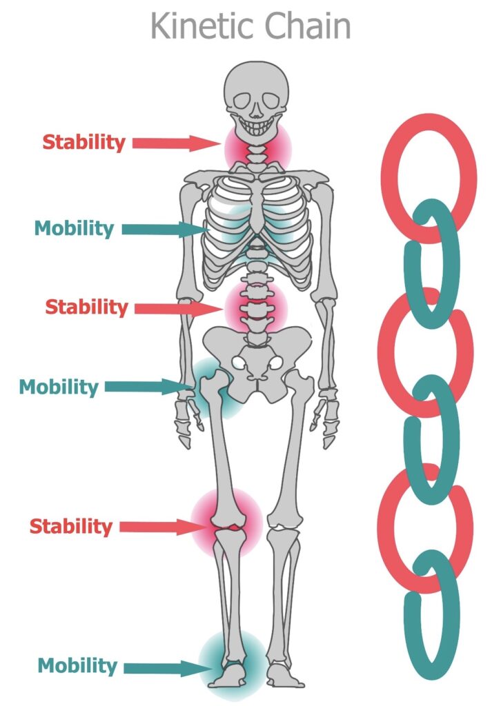 • モビリティ(可動性): 大きく動くのが得意な関節(足首、股関節、胸椎など)
